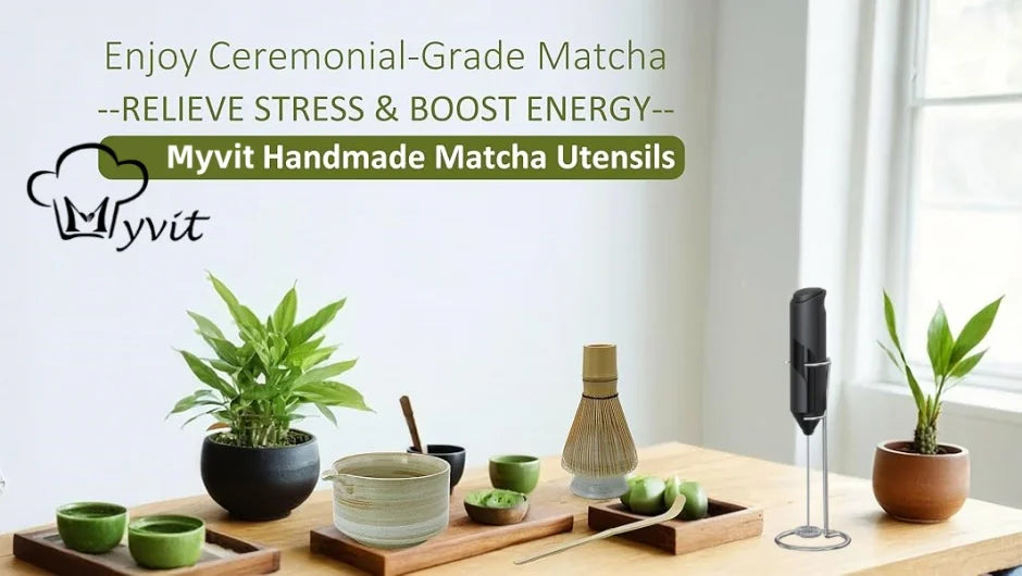Handcrafted Bamboo Whisk (Chasen): Designed with 100 prongs to expertly whisk matcha powder into a frothy, creamy consistency.